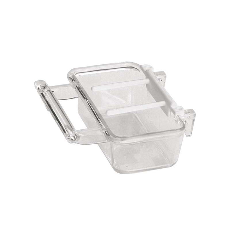 Bizcochera con Rastrillo. Comedero transparente con posadero para canarios, jilgueros y exóticos. Elaborado a partir de materiales resistentes.