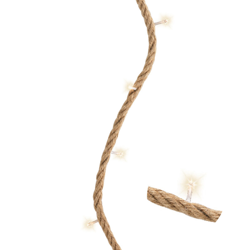 CUERDA DE YUTE CON BOMBILLAS LED INTERIOR CABLE TRANSPARENTE IP20 3MTS DISTANCIA ENTRE BOMBILLAS 10CM LARGO: 390CM LARGO TOTAL GUIRNALDA: 690CM BOMBILLA NO REEMPLAZABLE 40 LEDS LUZ CALIDA TRANSPARENTE 220V