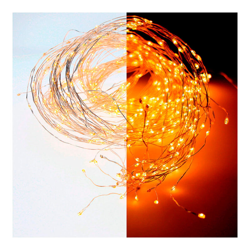 GUIRNALDA MICRO LED 190CM 640LEDS EFECTO FLASH LUZ CALIDA. CABLE PLATA. IP44 TRANSF. CABLE ALIMENTACION: 5M. DISTANCIA ENTRE PRIMERA Y ULTIMA BOMBILLA 1.9M LARGO TOTAL: 6.9M. 32 CUERDAS. BOMBILLAS NO REEMPLAZABLES.
