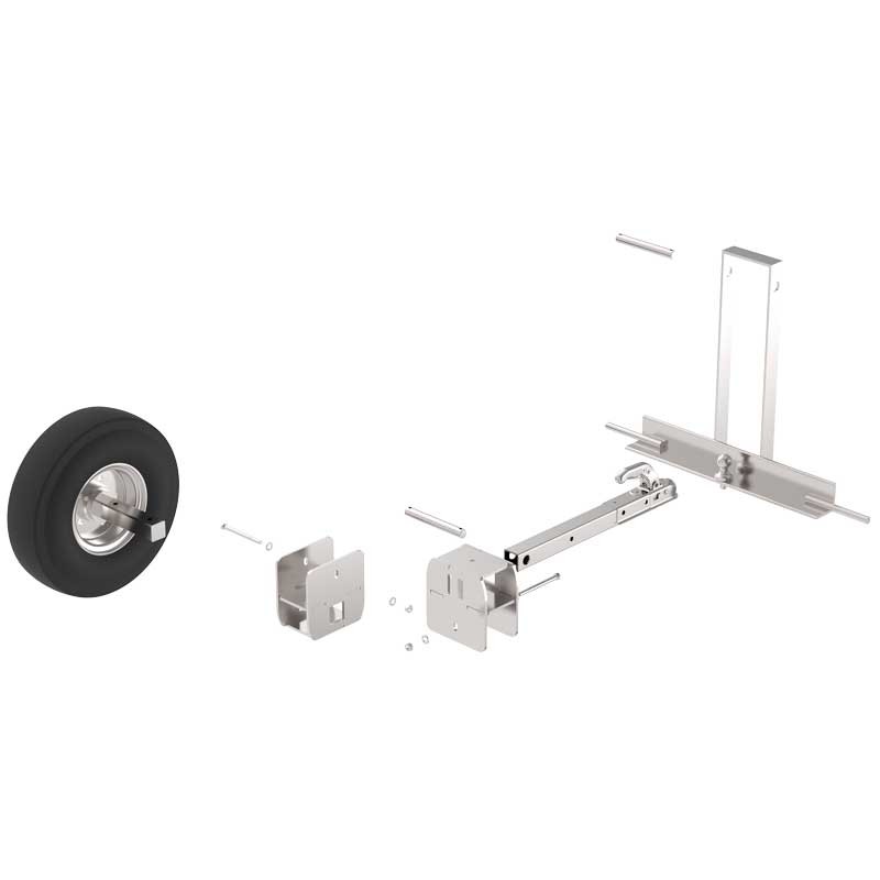 Kit para el corral móvil que permite enganchar al un vehículo de motor y mover el corral a una nueva ubicación fácilmente. Incluye ruedas y todos los seguros necesarios para garantizar un desplazamiento seguro de toda la estructura del corral.