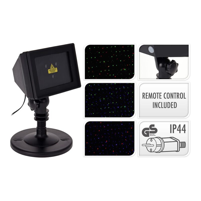 PROYECTOR LASER 3 COLORES EFECTOS VARIOS LASER DE CLASE 2 IP44 CON BASE INLCUIDA 5MTS DE CABLE 220-240V CON MANDO A DISTANCIA INCLUIDO (FUNCIONA CON PILA CR2025 INLCUIDA) 3 TIPOS DE VELOCIDAD CON TEMPORIZADOR CON EFECTO FLASH DIFERENTES COMBINACIONES DE COLOR 180X110X155MM