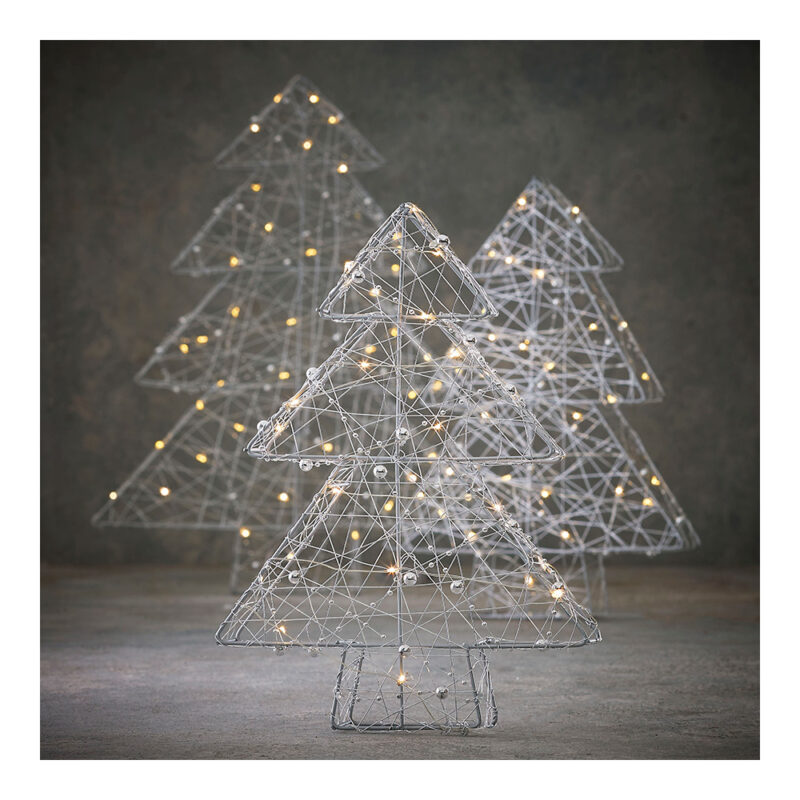 SET 3 ARBOLES PLATEADOS A PILAS LUZ FRIA . 90 LEDS. MEDIDAS 57X43X6CM. FUNCIONA CON 9 PILAS AA (NO INCLUIDAS).