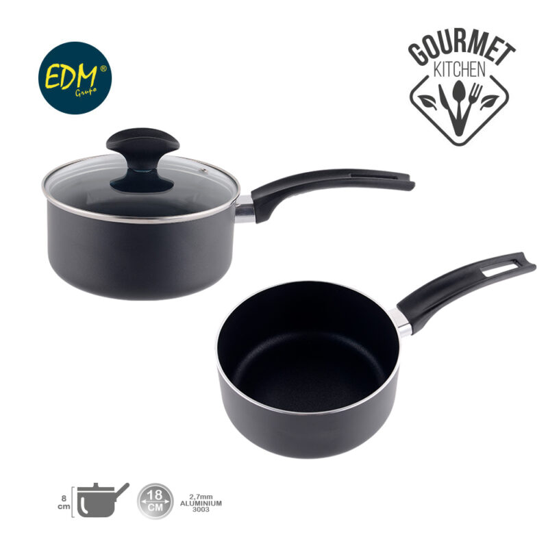CAZO ANTIADHERENTE – “BASIC LINE” – Ø18CM – ALTURA: 8CM – ESPESOR: 2,5MM – ALUMINIUM 3003 – WHITFORD TECNOLOGY – MAXIMA DURABILIDAD – FABRICADA SEGUN NORMATIVA UE – APTA PARA INDUCCION, VITROCERAMICA, GAS Y PLACA ELECTRICA – TAPA DE CRISTAL INCLUIDA – NO APTA PARA LAVAVAJILLAS – EDM