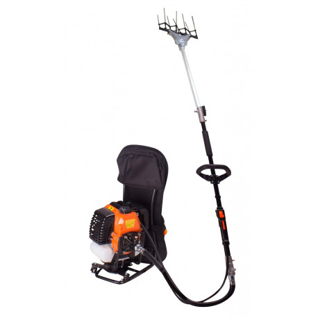 Vareadora con motor de 2 tiempos. Especialmente adecuada para la recogida de aceituna de vareo. Caja reductora ligera de sistema oscilante. Varillas de fibra de carbono en V que aumenta considerablemente el ancho de trabajo. Caña partida de aluminio de 26 mm.
